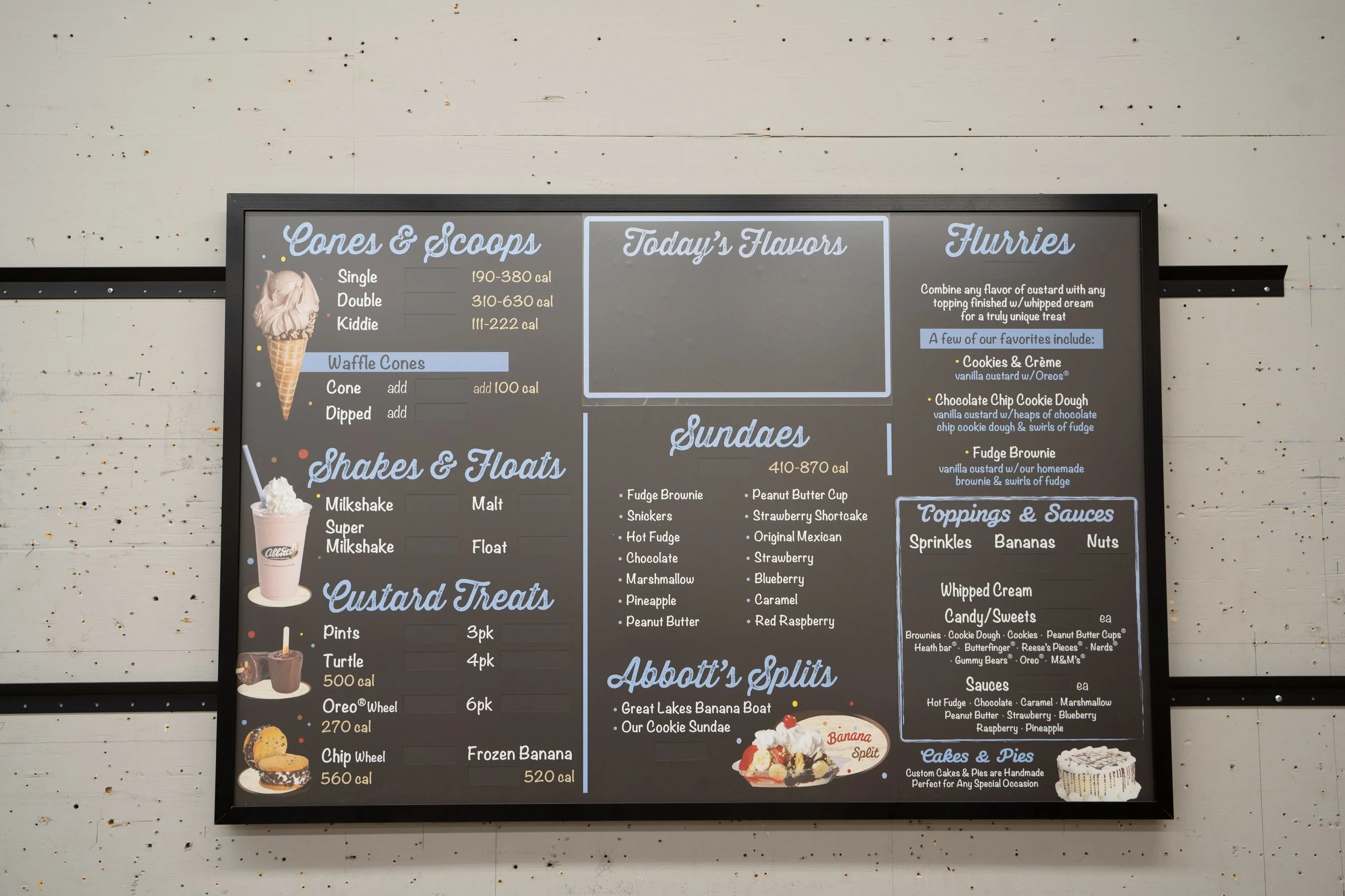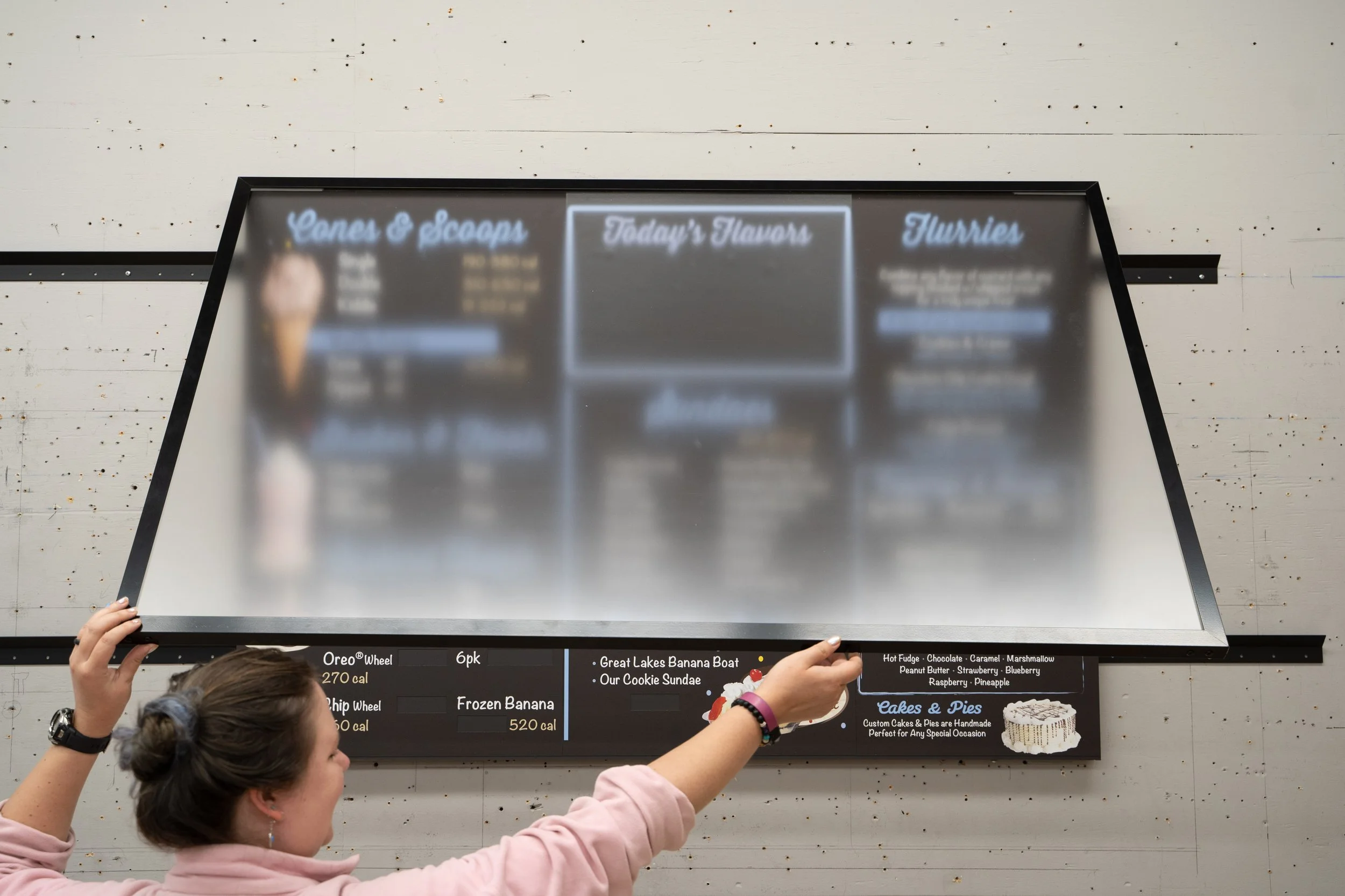 To create an outdoor case that utilizes magnet graphics and a non-glare cover that can be lifted up to change pricing and daily ice cream flavors.